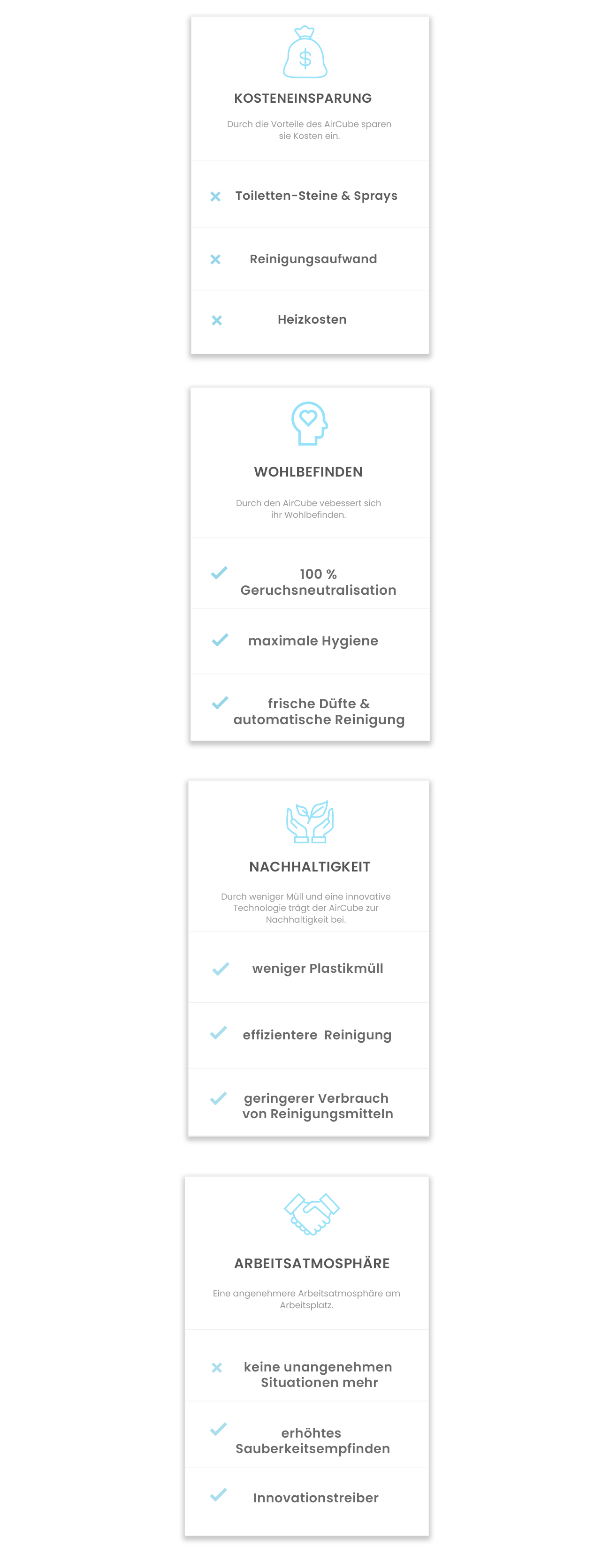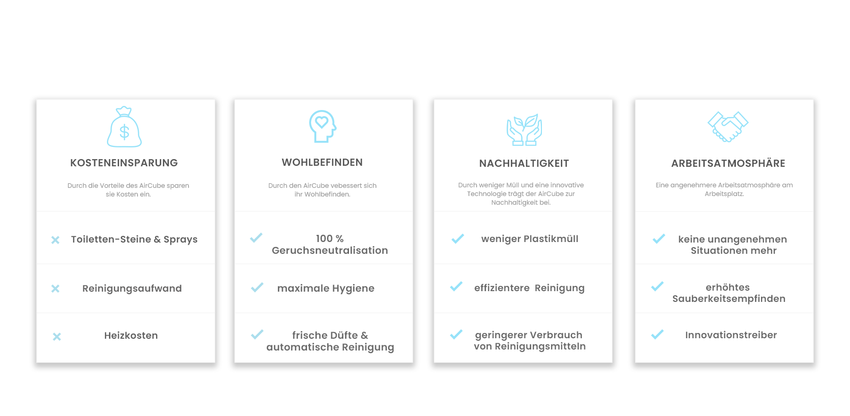 Der AirCube sorgt für ein rundum sauberes und frisches WC-Erlebnis in Ihrem Büro - ohne lästige Wegwerfartikel wie Sprays, Reiniger und WC-Steine. Vergessen Sie mühsames Nachkaufen und lästige Folgekosten! Unser speziell entwickeltes Filtersystem macht lästige Filterwechsel oder Nachfüllmittel überflüssig.